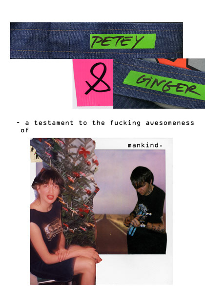 Danish filmmaker Ada Bligaard Søby, has traveled the world, turning stories about individual lives, art, and music into catalysts for discussion about the universal bonds between humans, and the ills and triumphs of society. In her film, Petey & Ginger - A Testament to the Awesomeness of Mankind, Søby explores the lives of two of her friends, Petey Dammit, bassist for the currently-on-hiatus San Francisco lo-fi psych/garage rockers Thee Oh Sees, and Brookyn-based fortune teller Ginger Partington. Petey and Ginger have never met, but share commonalities such as leaving behind the dysfunctional surroundings of their childhoods for city life, experiences working in the sex industry (Petey, in a distribution center, packing boxes of porn and sex toys for customers all over the world, and Ginger, previously a high-class escort), and an intelligent, outsider perspective on societal “norms.” Through their discussions, pitted against a backdrop of economic collapse, Søby shows a duality to the American landscape; one, a place for adventure, spontenaity, and friendship, the other bleak, imperfect, and self-destructive. Despite any impressions to the contrary, it seems that those who come out on top are those who never fit into mainstream constructs in the first place. At least that’s true for Petey and Ginger.